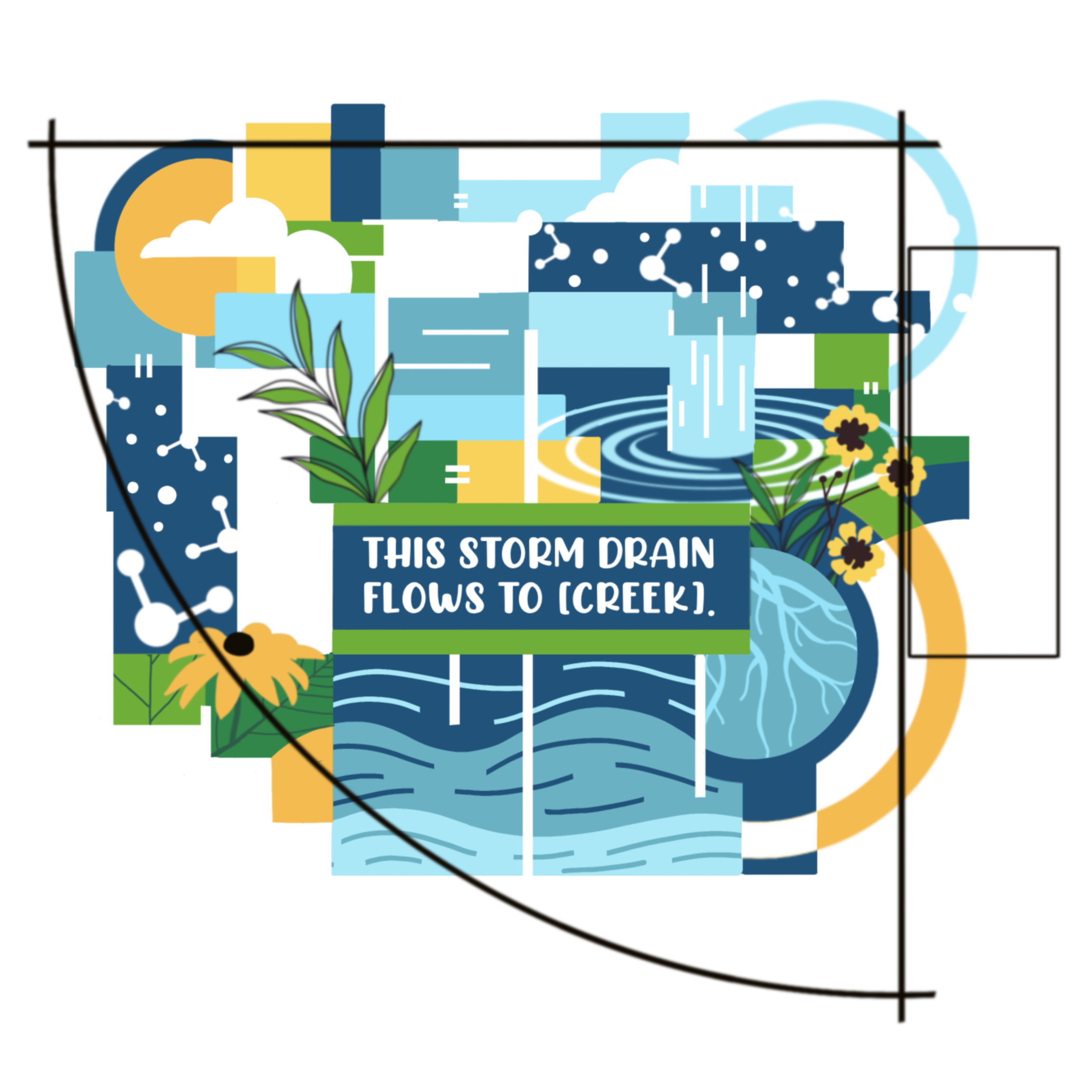 This mural presents a bold, geometric interpretation of how water moves through our environment, transforming an often-overlooked storm drain into a visual story about connection and flow. Using layered color blocks, directional linework, and simplified environmental forms, the design illustrates key moments in the water cycle: rainfall, absorption, movement through soil, and eventual return to local waterways.